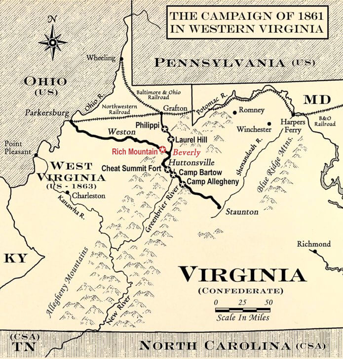 In one of the earliest engagements of the Civil War, Union regiments under the command of General George McClellan attacked and defeated Confederate troops defending a strategic mountain pass on the Staunton-Parkersburg Turnpike.