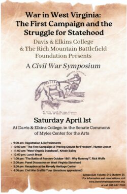 RMBF is hosting our annual Civil War Symposium in partnership with Davis and Elkins College this year! Hunter Lesser, Kristen Bailey, and Rick Wolfe will all explore what the First Campaign of the Civil War meant for West Virginia Statehood. Following the Symposium, there will be a reception at the Beverly Heritage Center featuring a tour of Beverly’s Civil War-era graffiti!