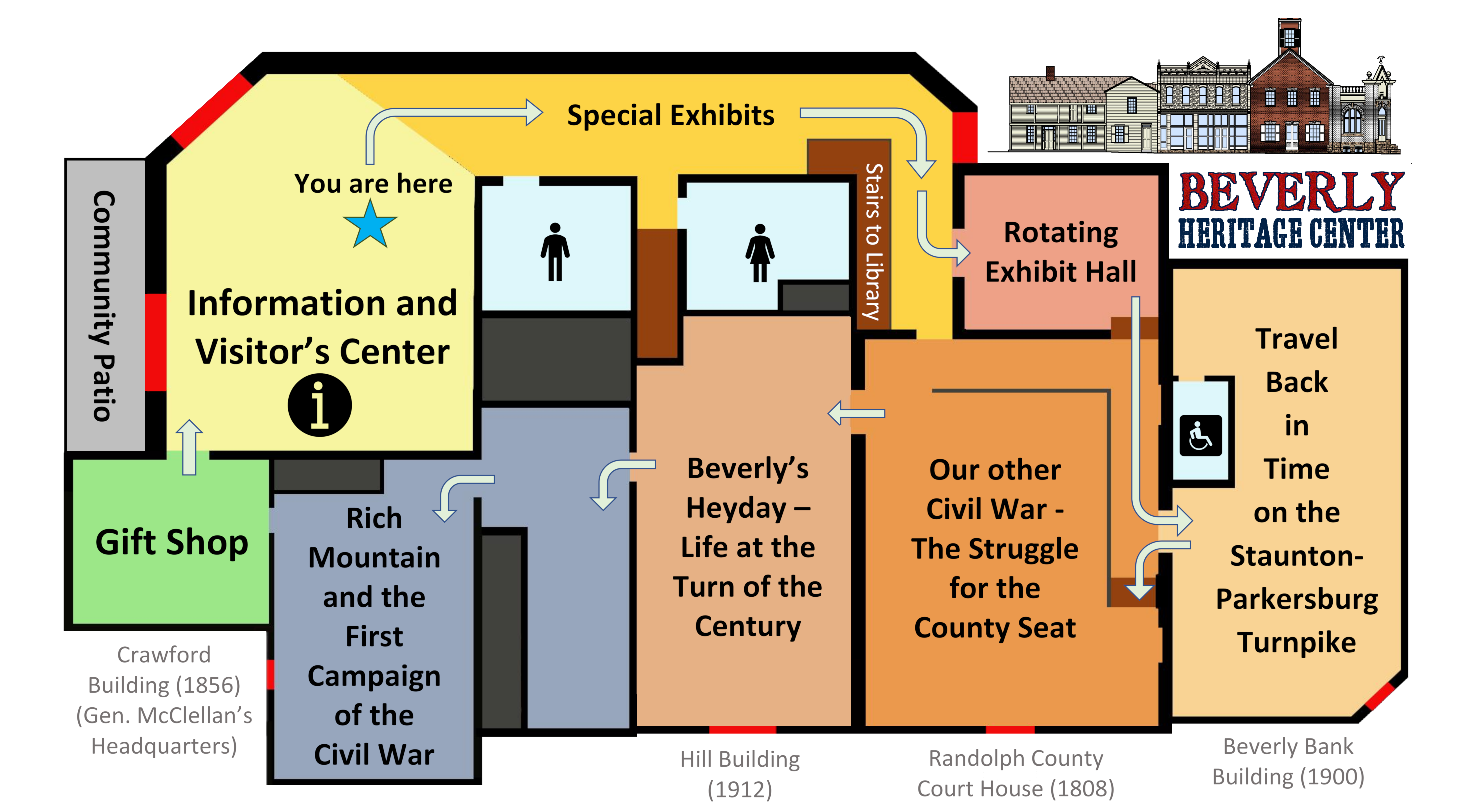 Take Rt 219/250 6 miles south from Elkins. Once in Beverly, turn east (left) at the town square at the intersection of Rt 219/250 and Court Street/Files Creek Road (one block south of the battlefield sign at Rich Mountain Road). Beverly Heritage Center is across from Town Square and next to Historic Beverly Antiques, with parking and entrance behind the buildings. Follow the red, white, and blue parking signs.